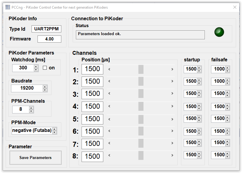 PCCng verbindet sich beim Start mit dem ersten kompatiblen PiKoder und lädt - typabhängig - die Controller-Einstellungen. Aktuell wird der PiKoder/SPE unterstützt.